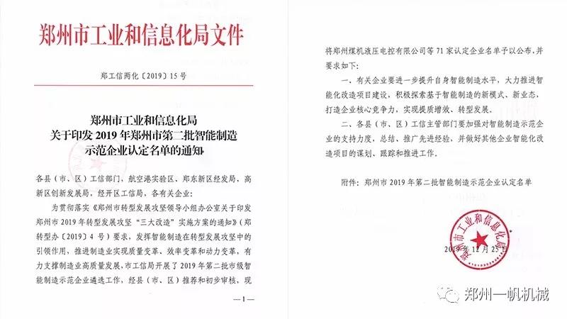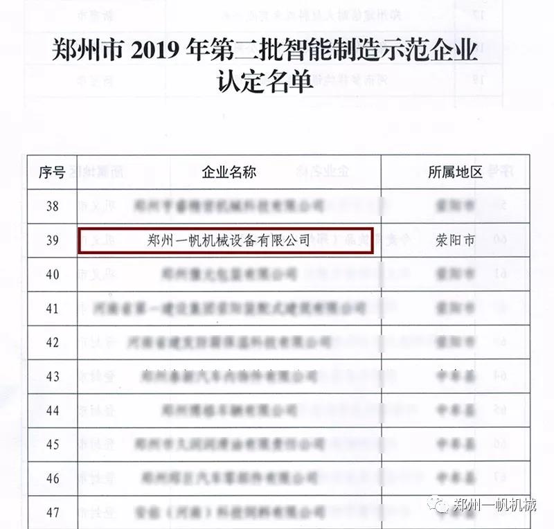 近日,鄭州市工業(yè)和信息化局傳來喜訊,鄭州一帆機械設備有限公司入選“2019年鄭州市第二批智能制造示范企業(yè)認定”名單,成為鄭州市2019年被認定的“智能制造示范企業(yè)”。