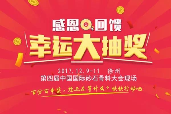2017年12月9日至11日,江蘇徐州即將召開“第四屆中國國際砂石骨料大會(huì)”,同期舉辦“中國砂石協(xié)會(huì)2017年年會(huì)”、“第二屆全國砂石骨料大賽”等活動(dòng),屆時(shí),鄭州一帆將會(huì)在現(xiàn)場舉行幸運(yùn)刮刮獎(jiǎng)活動(dòng),到現(xiàn)場的各位可以來到我們的13號(hào)展臺(tái)前參與活動(dòng),商務(wù)必備四件套、紅木書簽等豐厚大獎(jiǎng)就是您的了,凡到場各位還有精美禮品相送哦!